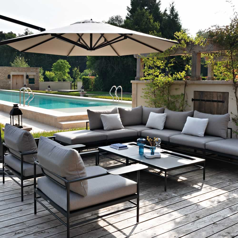 Mit der Kollektion Rivage definiert Fermob die Kunst des Carpe Diem neu. Eine modulare, elegante Kollektion, die jeden Ort in eine echte Entspannungsoase verwandelt. Sofa, Sessel ohne Armlehne, Eckelement, Hocker und Couchtisch lassen sich frei kombinieren. Für eine individuelle Lounge oder einen Rückzugsort am Pool, ergänzt durch eine passende Sonnenliege. Das besondere an Rivage? Das subtile Gleichgewicht einer leichten Aluminiumstruktur mit weichen, umhüllenden Kissen. Großzügige Module umschließen den Körper und laden dazu ein, innezuhalten und jeden Moment zu genießen.